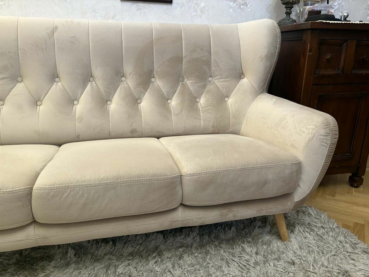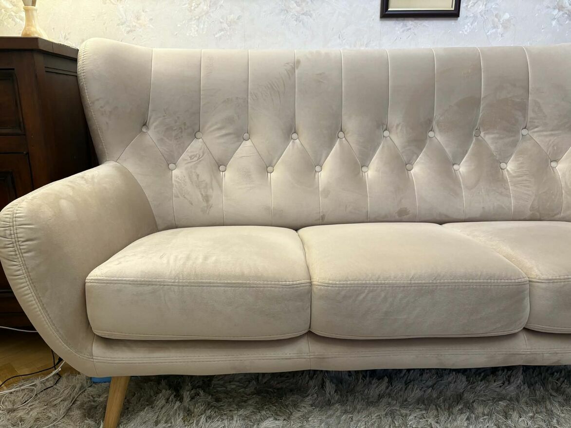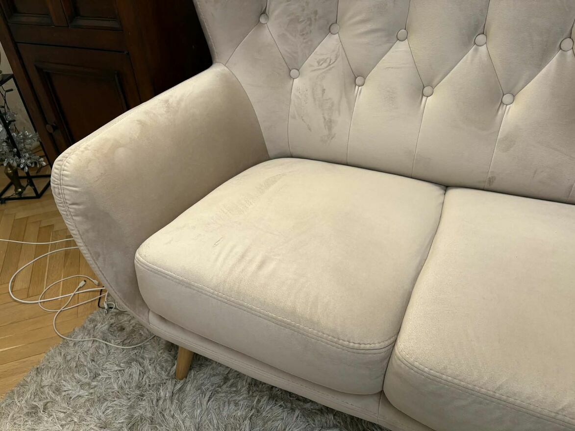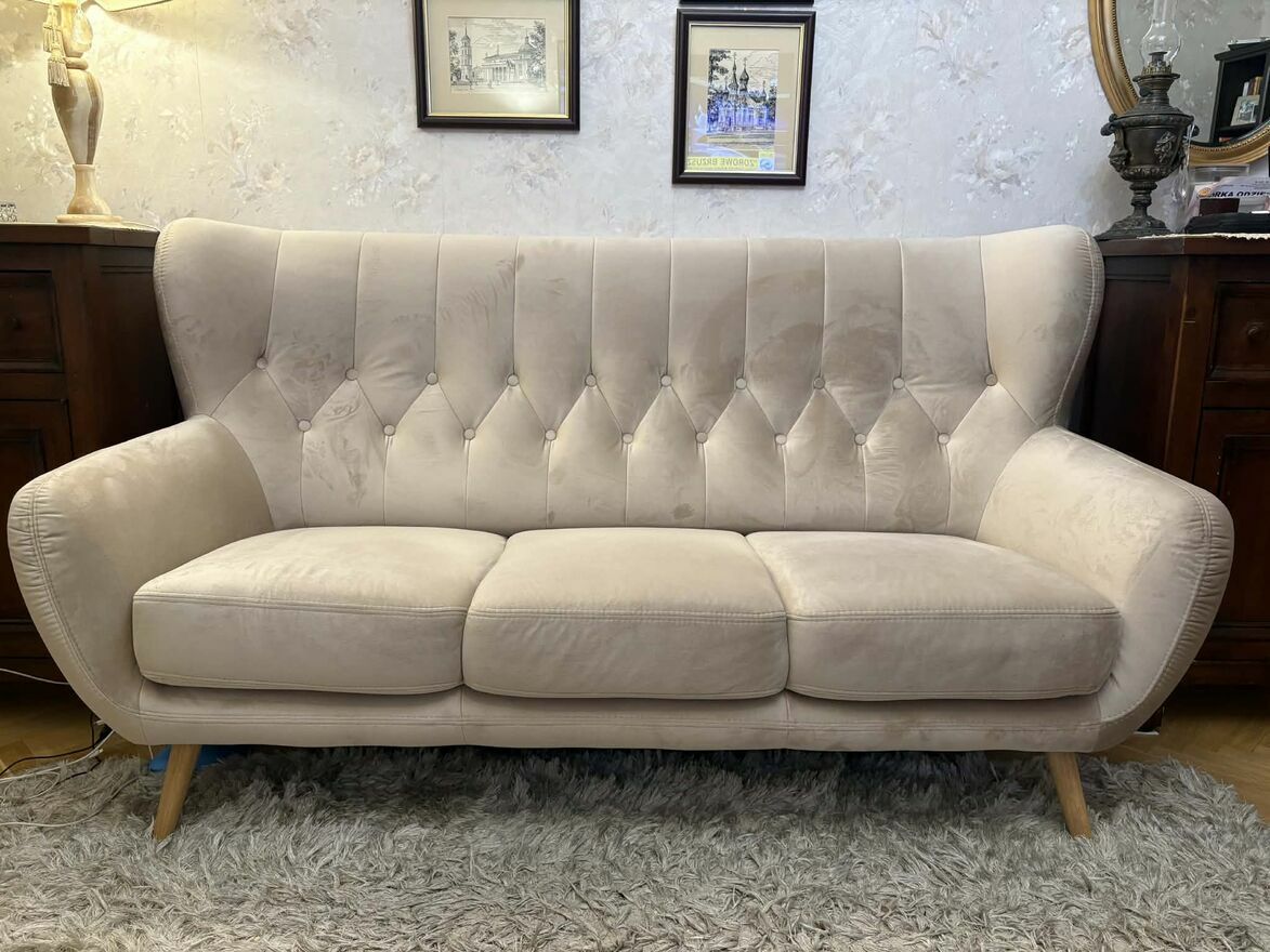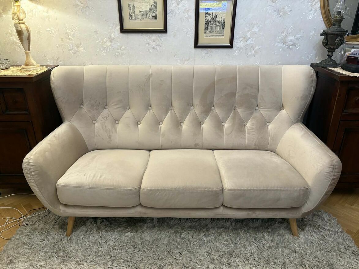 Wygodna i elegancka sofa w jasnym kolorze, idealnie pasująca do różnych aranżacji wnętrz. Mebel jest w bardzo dobrym stanie, jak nowy. Polecam! Wymiary na załączonym zdjęciuCeliński